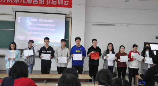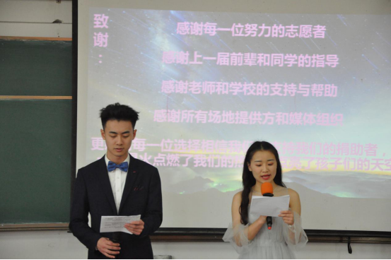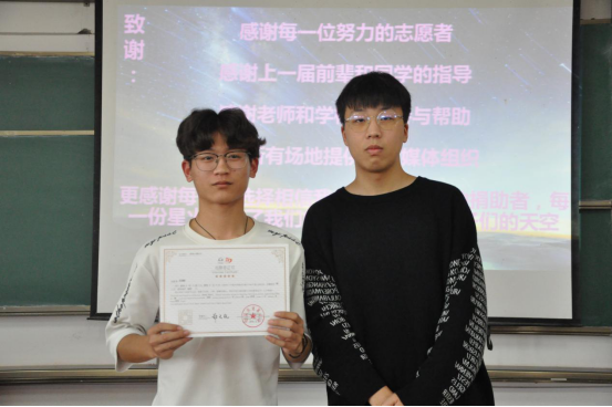 大会过半,老师们为优秀志愿者颁发获奖证书,表达对其参与的感谢。紧接着,优秀志愿者代表依次发言,他们用亲身经历告诉同学们要不畏困难,同时也要保持着一颗善心。最后,青协负责人俞佳烽同学上台领取了中国扶贫基金会授予的“爱心团体”证书并进行了发言,他在感谢志愿者努力的同时也表达了对下一年活动的期望。