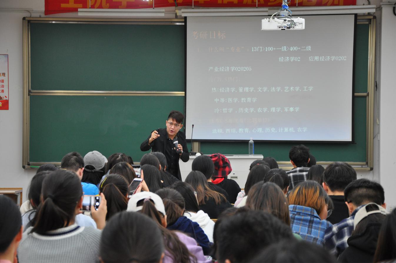 经验丰富的米雷老师以风趣幽默的语言风格活跃了课堂气氛,提升了同学们的课堂积极性。米雷老师从院校选择和考研科目复习策略这两大方面向在座的大三同学们分析介绍了近几年考研的重点方向和内容。他通过几个生动形象的例子,绘声绘色地让同学们清楚了解了考研不是一件可以临时抱佛脚的事情,它需要长时间的准备,备战考研,分秒必夺!讲座过程中,米雷老师特别指出考研所需要注意的事项:准考证要备多份,证件照要提前采集等等。他营造的诙谐风趣的讲座氛围,使在场的同学们都热情高涨,充分吸取了他传授的经验。