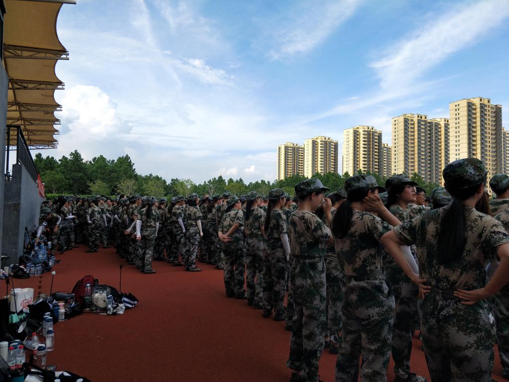 多天来的相处增进了我们和教官、营长、助理的感情,闲暇时光,同学们围坐在地上,谈天说笑,唱歌打闹,给枯燥乏味的训练增添了不少乐趣。下午依旧是骄阳似火,我们准时聚集在北区操场,迎来所有连队的第一次会操比赛。三点钟的北操场,暑气充斥着空气,大家都汗流浃背。
