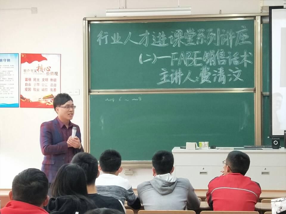11月8日下午,我分院于经管南楼205教室举行了行业人才进课堂系列讲座(二)——FABE销售话术。本次讲座由销售技巧三星导师费清汶老师主讲,部分学生参加了此次讲座。