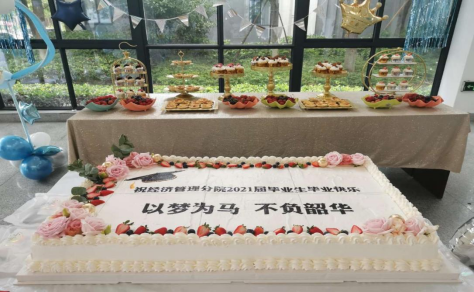 《明天你好》渐入耳畔,大屏幕上缓缓播放起2021届毕业生在元培学院里的点滴,共同回忆最美的大学生活。伴随着音乐和回忆,陈晖书记切下镶嵌着祝福语“以梦为马,不负韶华”的蛋糕,分发给在场毕业生,希望毕业生将来的生活也如同蛋糕一样甜甜蜜蜜。经管分院的各位班主任向2021届毕业生颁发学历证书和学位证书并合影留念,为毕业生们大学四年生涯的划上了一个充满仪式感的句号。