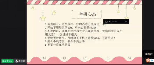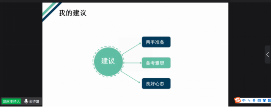 最后是获得多个国外院校OFFER的金诗婧学姐,金学姐仔细讲解了国外院校的申请过程和时间,同时也给考研学子们提供了新的备考思路,可以着手国内考研备考和国外offer申请两手准备,为自己的考研之路提供双重保险。