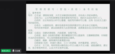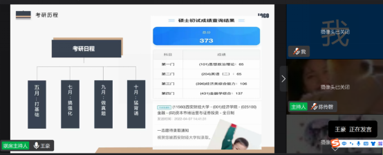 分享会正式开始,首先是已被西安财经大学金融专硕录取的王豪同学进行分享,他从考研历程、专硕数三改换396以及自身的备考经历等方面对金融专硕备考事项进行了充分的阐述和说明,最后还给学弟学妹们考研备考送上了祝福和鼓励。