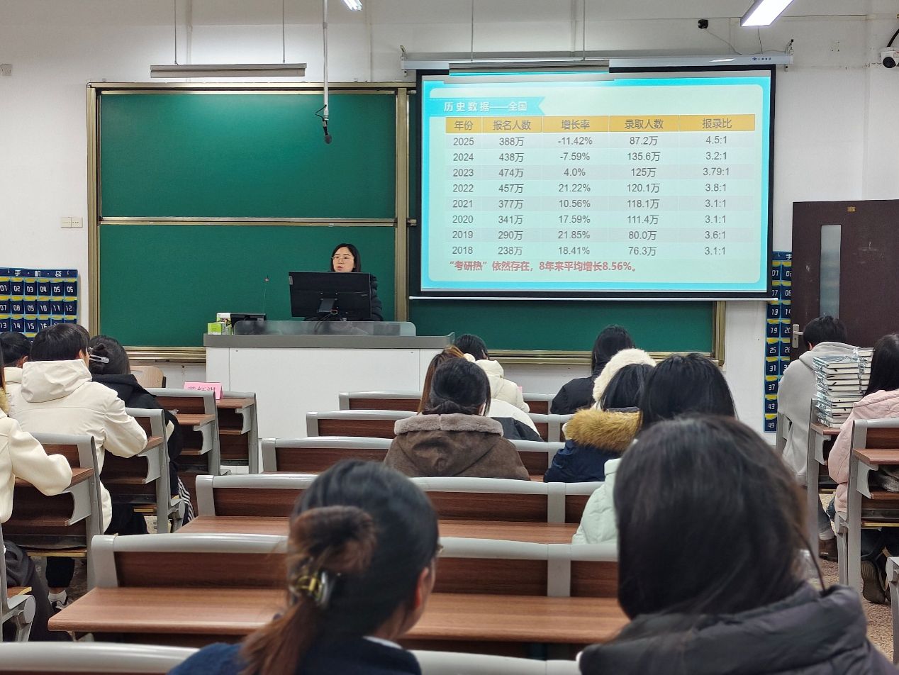 陈晖副书记结合就业市场趋势与考研政策变动,强调研究生学历是应对人才竞争、进入核心岗位的重要保障,鼓励同学们将个人深造与国家科技自立自强需求紧密结合。他叮嘱大家理性择校、科学制定复习计划,保持规律作息,学校与老师将全程提供支持。