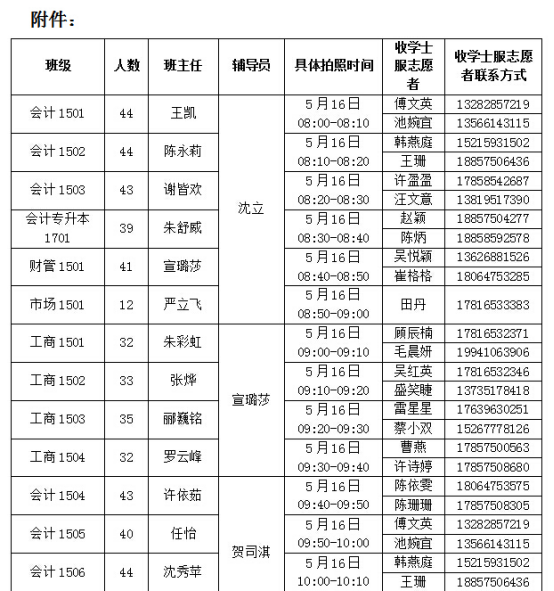 5月16日上午8:00点开始,如遇中雨或大雨,拍摄时间地点另行通知。请各班组织毕业生按照要求的时间集合,参加合影的教师请提前做好教学任务安排。