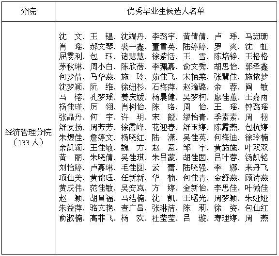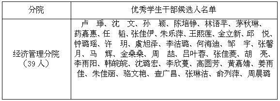 根据《绍兴文理学院元培学院关于开展2019届院级优秀毕业生、优秀学生干部评选工作的通知》要求,坚持公开、公平、公正的原则,经过学生个人提供相关材料证明(学习成绩、获奖情况等材料)、经分院审议,拟定推荐经济管理分2019届院级优秀毕业生133人,优秀学生干部39人。公示时间:2018年11月26日—11月29日。若有异议,请广大师生及时以口头或书面形式向分院综合办反映。办公室:1号教学楼411室,联系人:潘思慧,联系电话:0575-88345813。