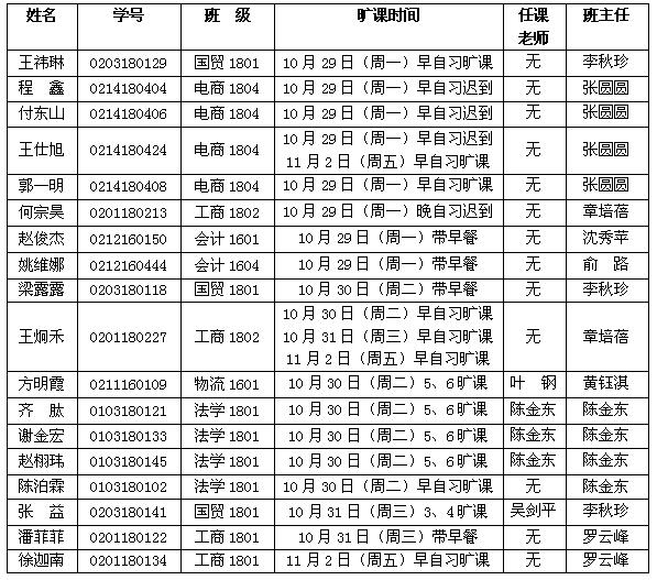 根据分院学工办学风督导小组抽查结果反馈,王祎琳等18名同学在2018年10月29日-11月2日(第八周)正常上课期间出现旷课行为,违纪属实。