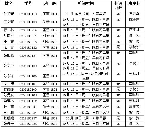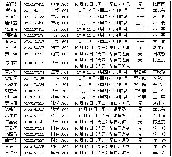 根据分院学工办学风督导小组抽查结果反馈,付子攀等47名同学在2018年10月15日-10月19日(第六周)正常上课期间出现旷课行为,违纪属实。
