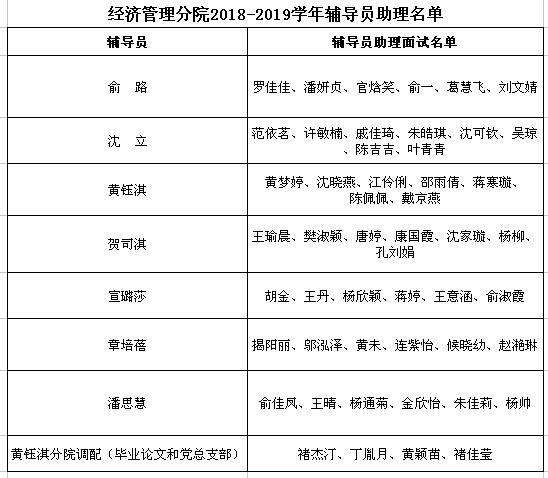 根据《关于经济管理分院辅导员助理的招聘通知》,在学生申报、分院初步筛选、统一笔试和面试的基础上,拟聘任以下同学担任2018-2019学年经管分院辅导员助理,具体名单如下。公示时间:9月29日——10月1日。若有异议,请在公示期间向责任区辅导员反馈。电话88345813,办公室:1-412.