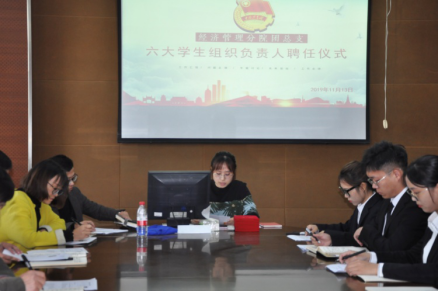 11月13日下午,我分院在经管北楼414会议室召开六大学生组织换届聘任仪式。本次会议由分院贺司淇老师主持,出席本次会议的有经管分院杨文兵院长、经管分院党总支陈晖书记、综合办全体辅导老师、分院六大学生组织负责人参加本次会议。