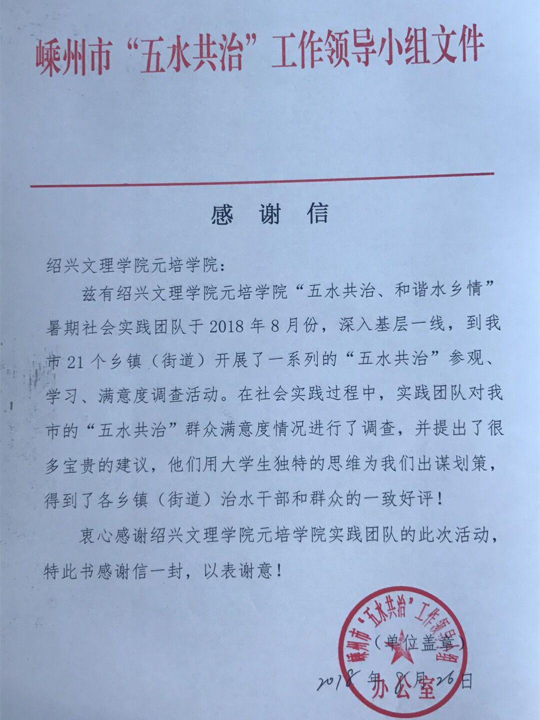 嵊州市“五水共治”工作领导小组给学院的感谢信
