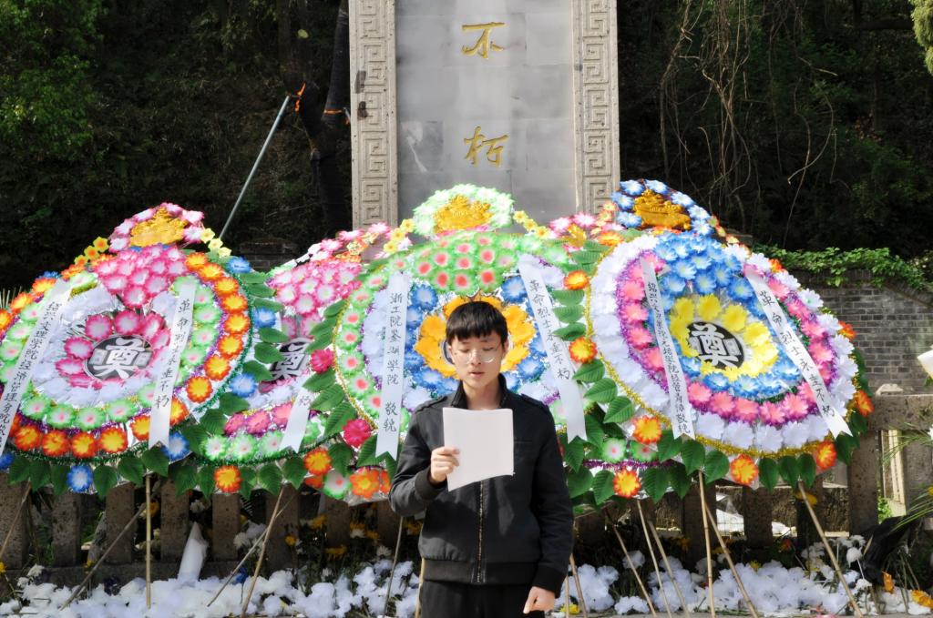 “历史和现实告诉我们,年轻一代有理想和担当,国家就有前途,民族就有希望。无数革命先烈抛头颅、洒热血,才换来了我们今天的幸福生活。我们应该好好珍惜,以党的十九大精神为指引,在创新创业中增长智慧才干,在艰苦奋斗中锤炼意志品质,用青春书写无愧于时代、无愧于历史的华彩篇章。”分院青年志愿者协会负责人赵同学在烈士纪念碑前庄重致辞。