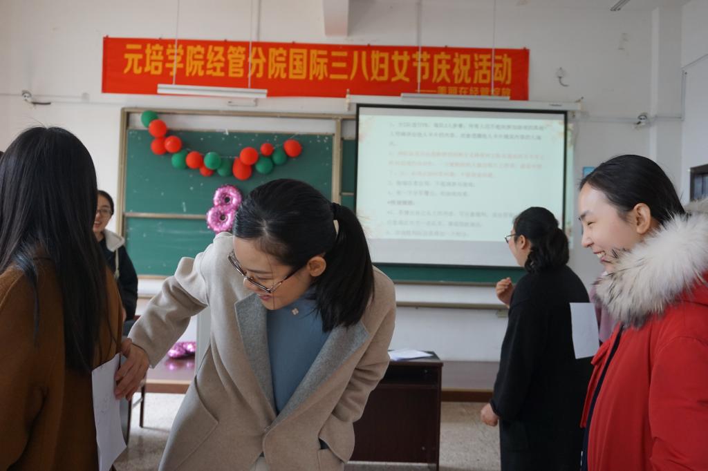 在第108个“三八”国际劳动妇女节之际,为了促进教职工之间的友谊与交流,调动大家工作的积极性、主动性和创造性,围绕“快乐经管,情醉三·八”这一主题,我分院全体女教师在1-106室开展了三八妇女节教职工趣味活动。据悉,今年是分院第13个年头开展丰富多彩的活动庆祝国际三八妇女节。