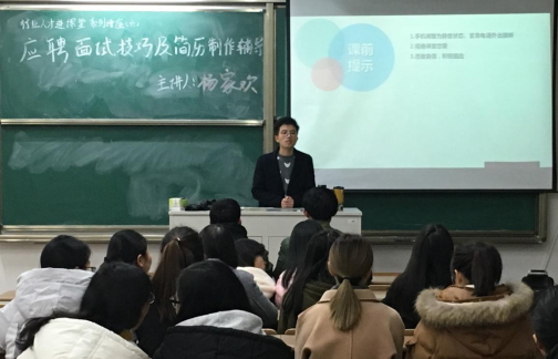 此次讲座主题为“应聘面试技巧及简历制作辅导”,旨在分享应聘面试技巧及简历制作心得。讲座伊始,杨家欢先生做了一个小调查,初步了解学生对于制作简历、面试及就业的看法,并提醒学生一定要明确自己适合什么工作。接着阐述了在应聘面试时需要展现自己,突出自己的能力,还向学生列出面试应该准备的事项及如何应对面试问题的技巧。