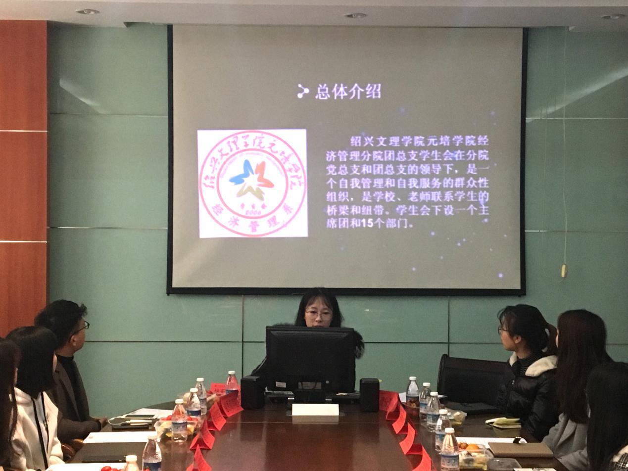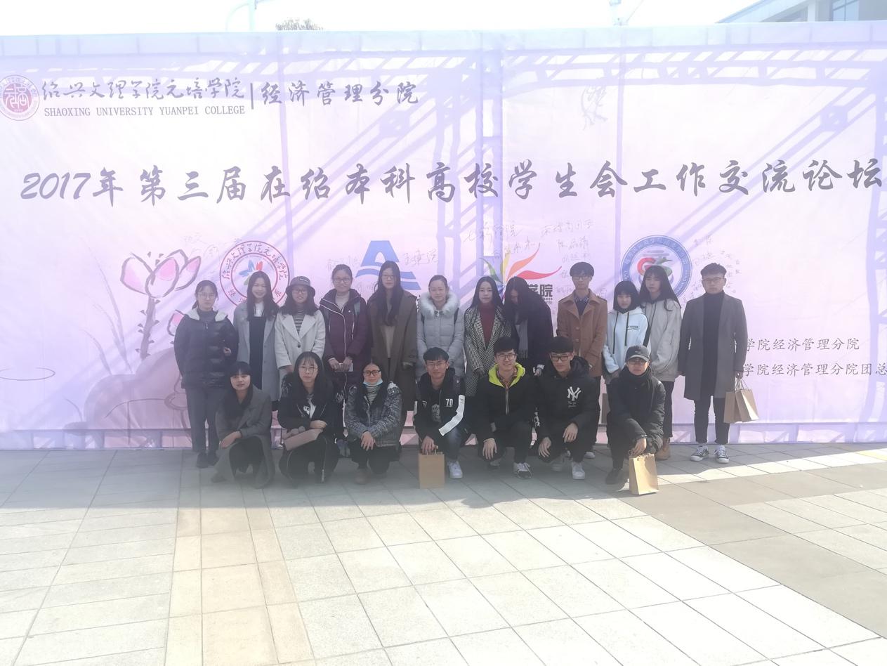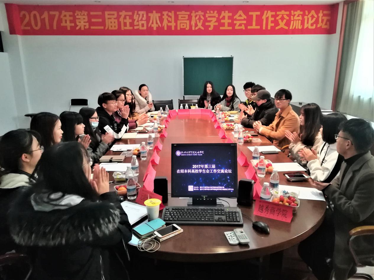 为了传达党的十九大精神在高校学生干部团队建设中的指导作用,促进在绍本科院校之间的交流,12月10日上午,由我院经济管理分院主办的第三届在绍本科高校学生会工作交流论坛在我院2-408会议室隆重举行。绍兴文理学院经济与管理学院委员会主席团成员、浙江工业大学之江学院商学院委员会主席团成员以及浙江越秀外国语学院国际商学院团委学生会主席团成员出席了此次学生会交流论坛。论坛由我院经管分院学生会主席沈文主持。会议分享了四校各级团组织学习党的十九大精神的经验和成果,围绕“十九大精神在团干培养中的融合”,结合自身实际,分别做了交流发言。