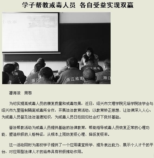 近日,《浙江法制报》以“学子帮教戒毒人员 各自受益实现双赢”为题报道我分院法学专业学生与绍兴市九里强制隔离戒毒所合作,开展法治教育活动。全文如下: