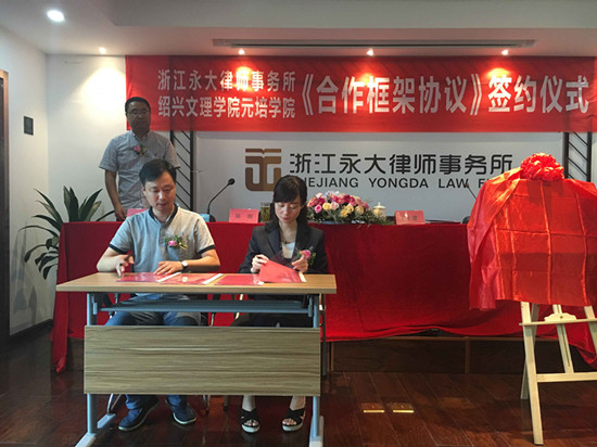 永大所管委会主任王永建首先对绍兴文理学院元培学院的各位领导表示热烈欢迎,同时指出“校企合作”是一种“双赢”模式,既让学生在校所学知识与企业实践有机结合、得到技能,学校得到发展,又让企业可以从中选拔优秀人才,为服务地方社会经济建设作出积极贡献。随后,绍兴文理学院元培学院经济管理系陈晖书记与律所主任俞岚签订了《校企合作协议》,并共同为本次合作揭牌。