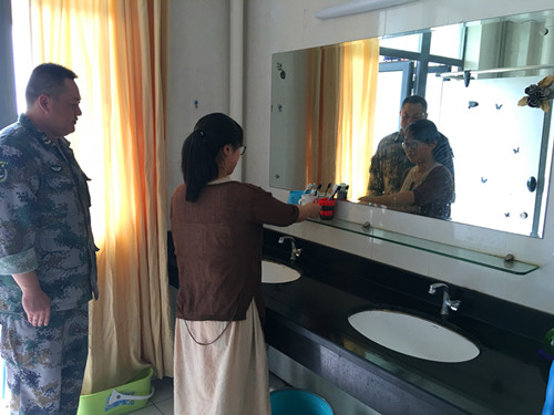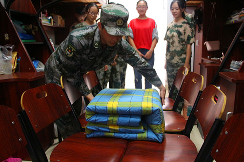 9月8日和9月9日,我分院各连队的教官们分别来到学生宿舍,认真向同学们示范如何整理内务,包括叠被子、整理鞋架、整理书架以及如何美观的摆放生活物品。教官们边讲解边示范,同学们也积极提出问题,在反复的提问和解答过程中,一个豆腐块似的被子在教官手下成型,一排排整齐的军鞋使得同学们赞叹不已。