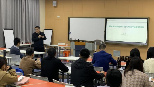 11月16日下午,我分院邀请绍兴市文化产业研究院院长、绍兴市文化产业促进会副会长兼秘书长应锋老师于1-205开展了题为“网络大城市背景下绍兴文化产业发展趋势”的专题讲座。讲座过程中,应锋老师对网络大城市背景下绍兴文化产业的发展趋势进行了深入的剖析。