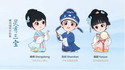 嵊州自古钟灵毓秀、人杰地灵。嵊州城市IP形象“灵秀三宝”,创意源自1600多年前的《晋戴逵剡山灵秀图》,现珍藏于台北故宫博物院,由宋徽宗御笔题名,乾隆题跋诗赞“山川灵秀称江南”。“灵秀三宝”IP形象寓意嵊州“万年文化小黄山、千年剡溪唐诗路、百年越剧诞生地”,分别取名嵊嵊、剡剡、越越。