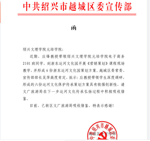 近日,我分院应锋副教授带领绍兴文理学院元培学院经济管理分院电子商务2101班的同学前往浙东运河文化园开展《营销策划》课程现场教学,形成6份浙东运河文化园策划方案被越城区委常委、宣传部部长吴萍高度肯定并批示,且被绍兴市越城区文广旅游局吸收借鉴。