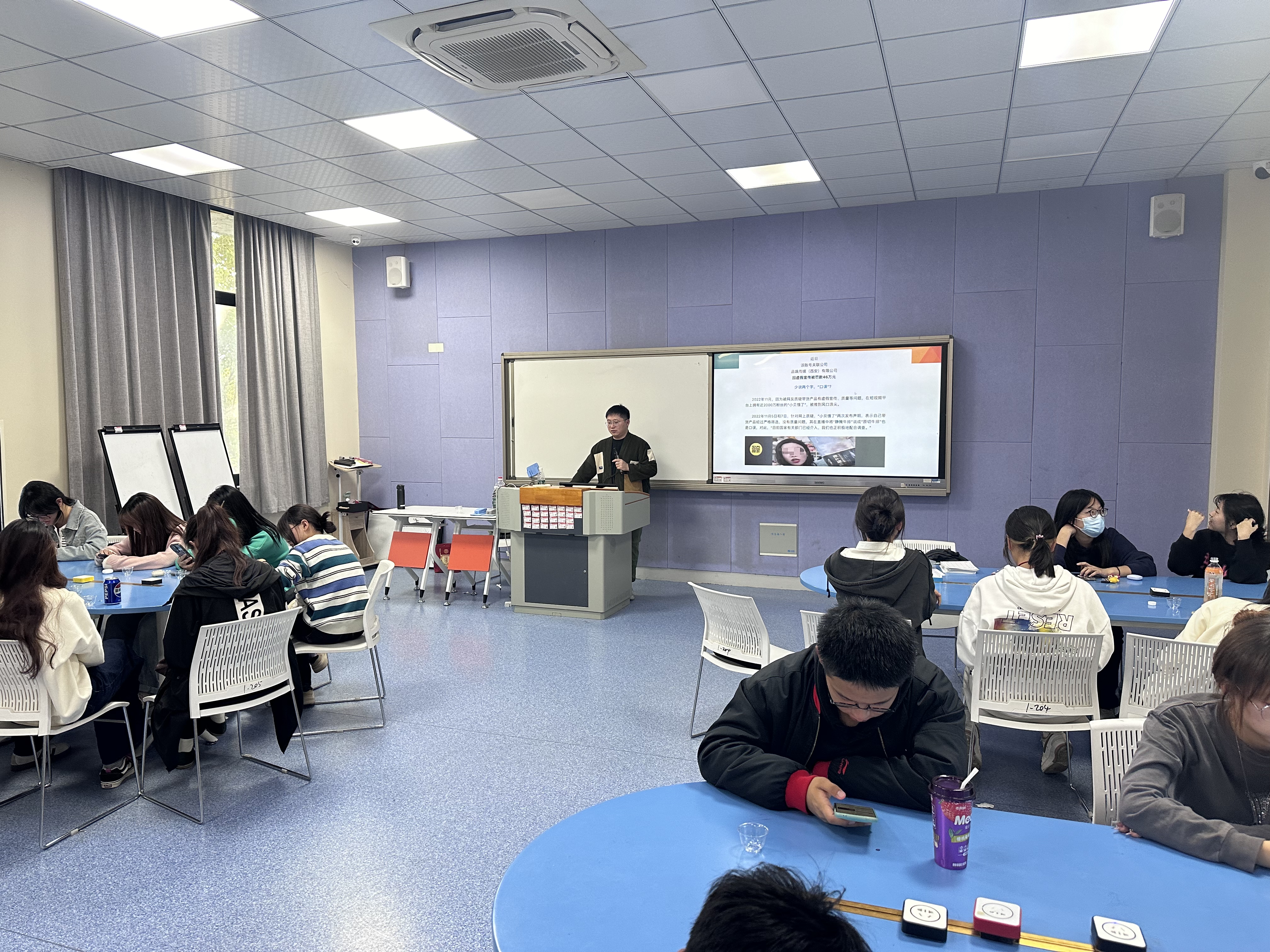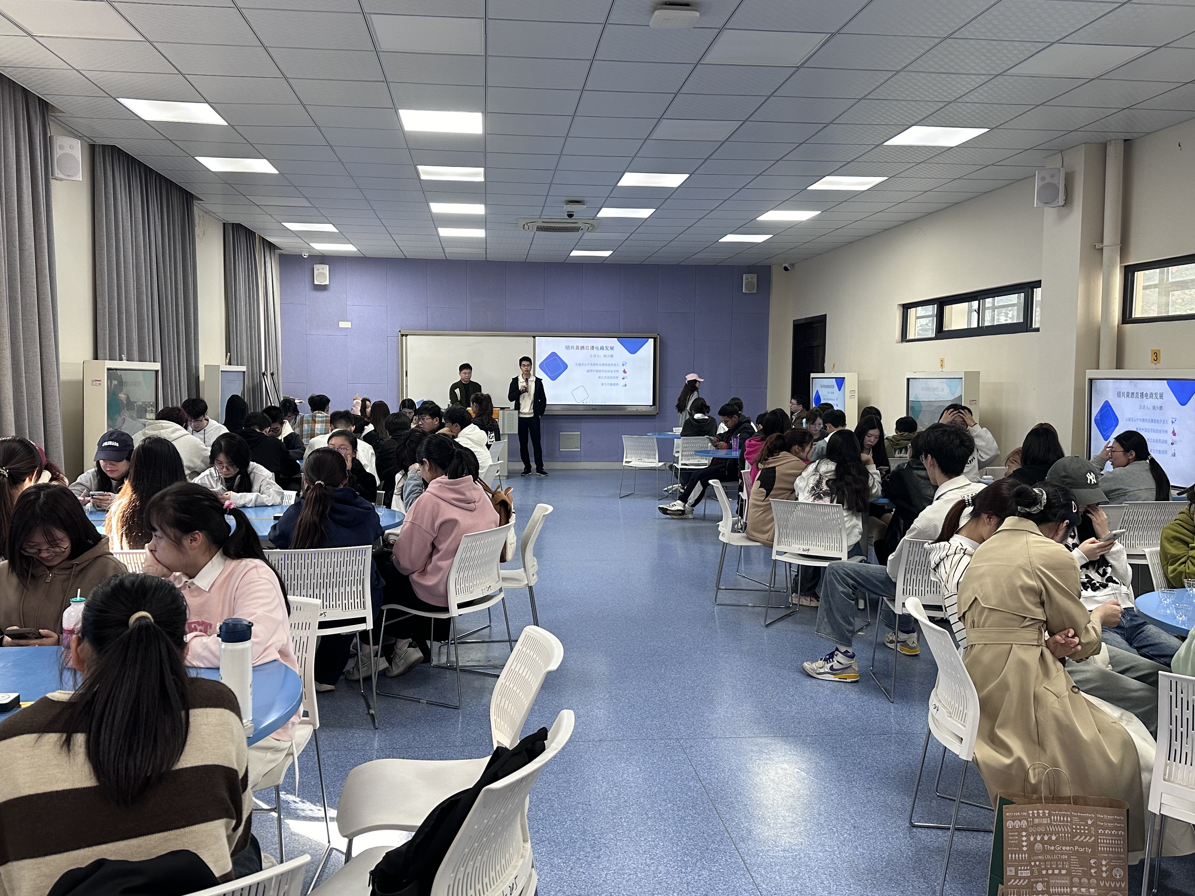 姚老师抛出 “为什么选择绍兴黄酒”、“直播电商现在发展到哪一阶段了”、“选择做直播电商还来得及吗” 三个引人深思的问题巧妙地将绍兴黄酒与时代前沿的直播电商发展紧密联系起来。他运用大量真实案例,有力地论证了黄酒电商发展的光明前景,激励同学们学以致用,积极投身到绍兴特色黄酒文化的宣传推广中。
