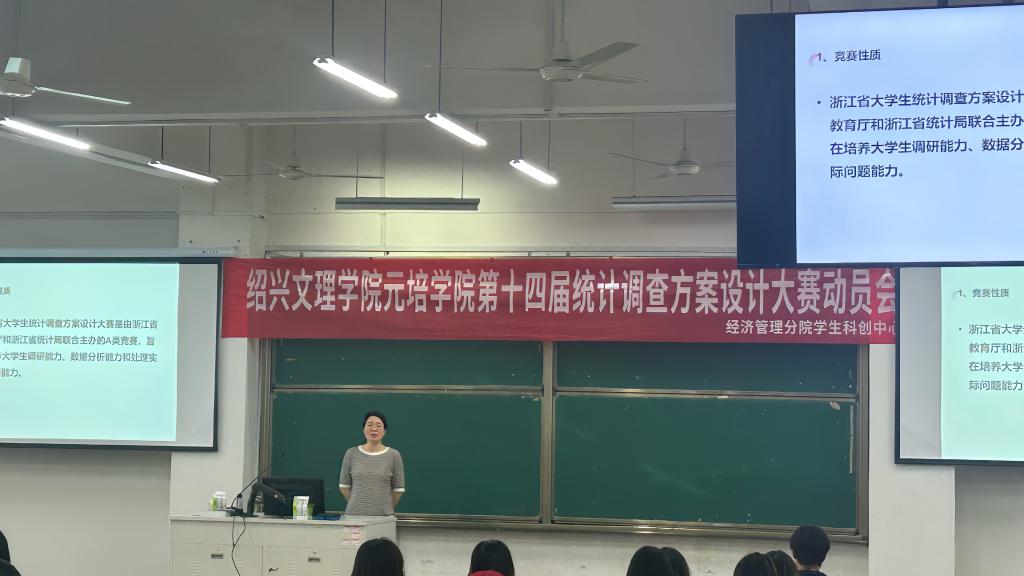 会议上,朱彩虹老师从竞赛性质、竞赛时间、竞赛流程、组队要求四大方面向同学们全面地介绍了统计调查方案设计大赛。朱老师指出:“统计调查大赛属于A类竞赛,旨在培养大学生调研能力、数据分析能力和处理实际问题能力,其含金量及对个人生涯的帮助是大部分比赛无法超越的。在未来不论是对考研还是就业都有极大的价值。”朱老师介绍到竞赛由四月中旬启动,一直到十一月份的省赛决赛,历时近七个月,期间牺牲许多休息时间,尤其是暑假,战线较长,需要大家有强大的毅力,对大家的意志力是一个巨大的考验,希望同学们做好充分的心理准备。竞赛过程中,参赛选手要完成确定主题、设计调查方案、实施调研、撰写调研报告等多项活动,这要求参赛者们需要有敏锐的社会热点观察能力、充足的技术性和统计方面的知识。朱老师鼓励同学们跨分院跨专业组队,打造一支能力互补、知识面较为丰富的队伍,也建议同学们多借鉴之前参赛选手的优秀作品和竞赛心得,吸取经验。