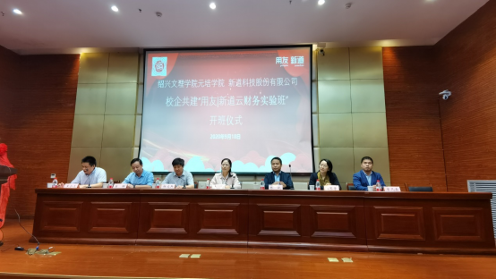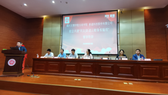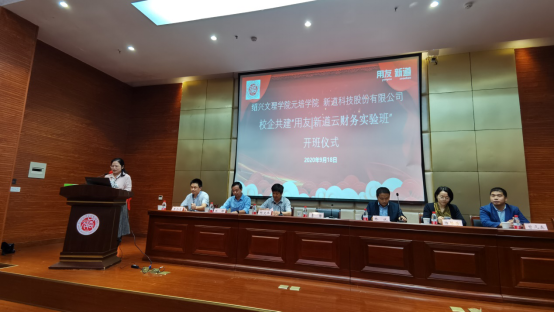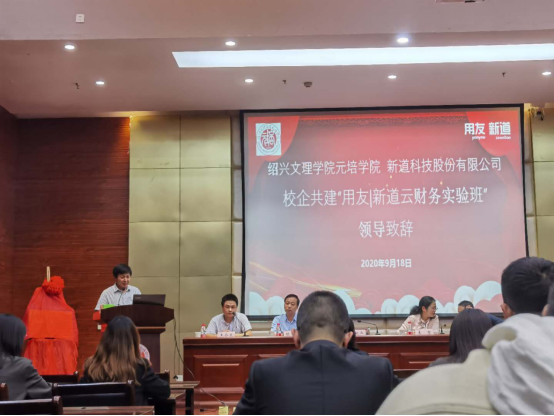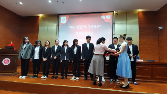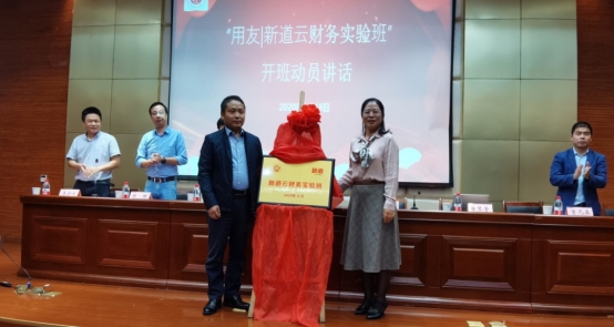 仪式上,学院副院长李黎教授和新道科技浙江区总经理林斌先生共同为“用友|新道云财务实验班”揭牌。