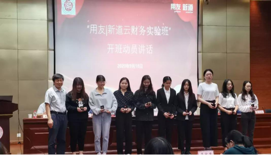 随后,校企领导分别为“新道云财务实验班”同学们授予了“云财务管理会计师”班级徽章。