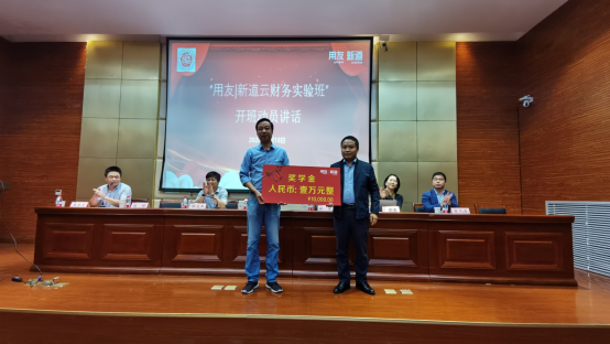 经济管理分院陈晖书记代表分院接受新道科技股份有限公司捐赠的一万元奖学金。